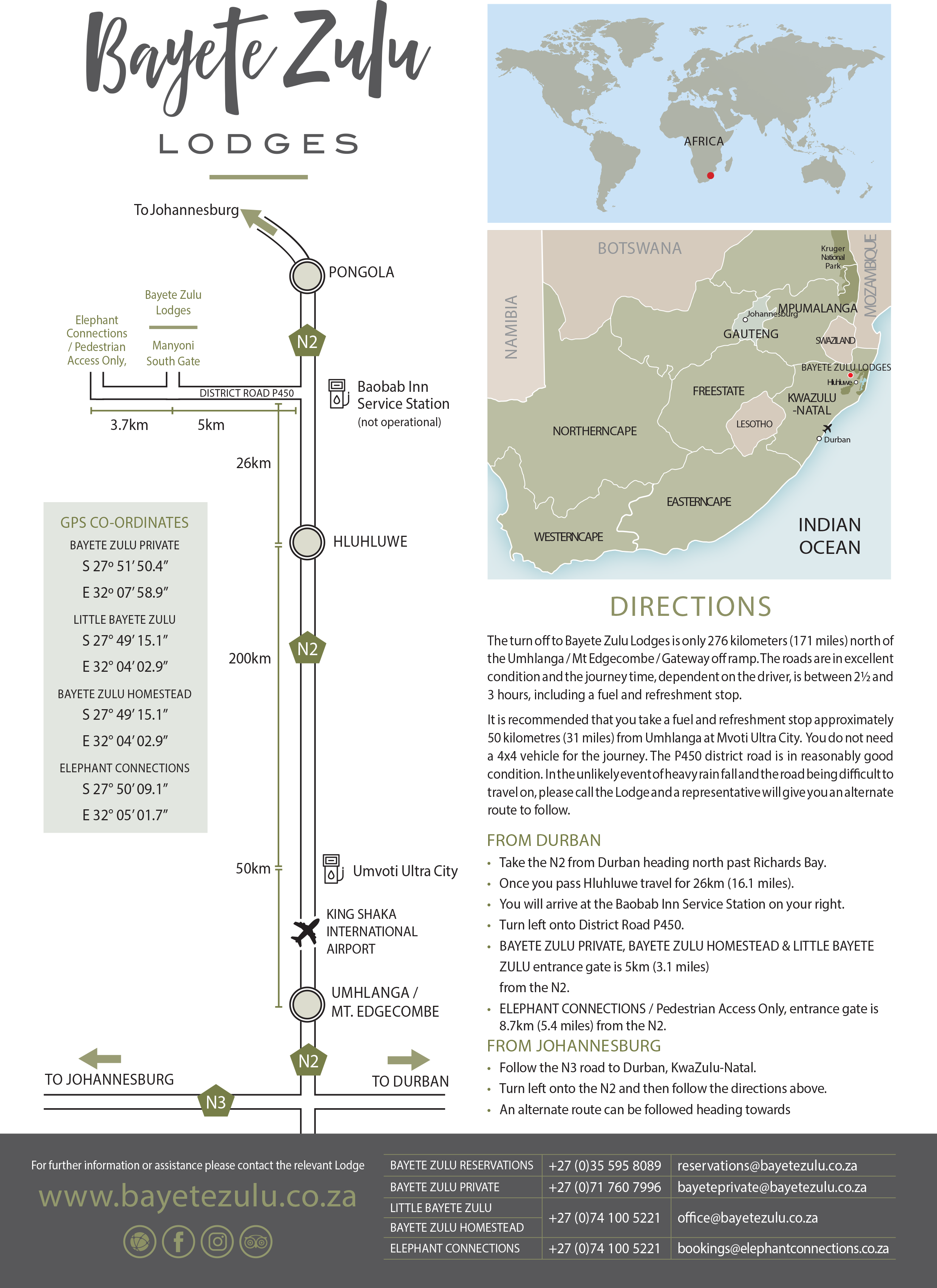 The turn off to Bayete Zulu Lodges is only 276 kilometers (171 miles) north of the Umhlanga / Mt Edgecombe / Gateway off ramp. The roads are in excellent condition and the journey time, dependent on the driver, is between 2½ and 3 hours, including a fuel and refreshment stop.